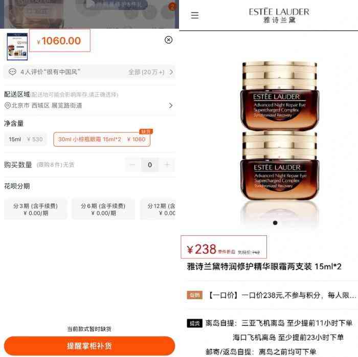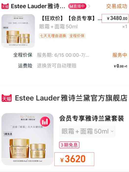 雅詩蘭黛旗艦店同一款產(chǎn)品,6月(上圖)與7月(下圖)的價(jià)格變動(dòng)。
