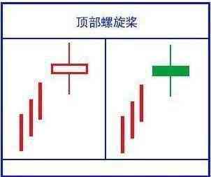 3、上下影線很長(zhǎng)且基本等長(zhǎng),很像飛機(jī)上的螺旋槳,且頂部出現(xiàn),所以叫頂部螺旋槳。頂部螺旋槳是轉(zhuǎn)勢(shì)信號(hào),特別是有一段大漲幅后出現(xiàn),下跌信號(hào)更加明確。