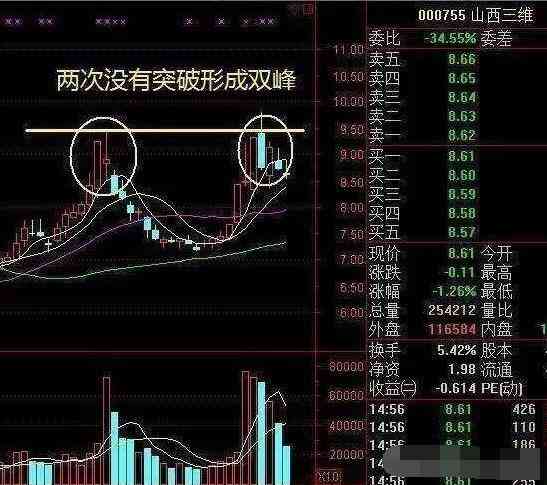 股價(jià)連續(xù)兩次沖擊某個(gè)價(jià)位都出現(xiàn)了回落,K線組合看起來(lái)就是兩個(gè)高高的雙峰。像山西三維就是這個(gè)走勢(shì),近期兩次沖擊9.5沒有成功,股價(jià)只能順勢(shì)回落。