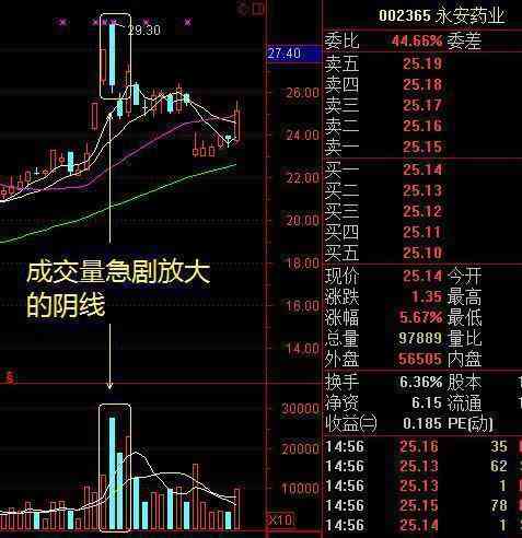 股價(jià)在連續(xù)上漲后出現(xiàn)一根大陰線,而且成交量急劇放大,這說明主力在不計(jì)成本地出貨,此時(shí)應(yīng)該趕緊離場(chǎng)。看下圖永安藥業(yè)