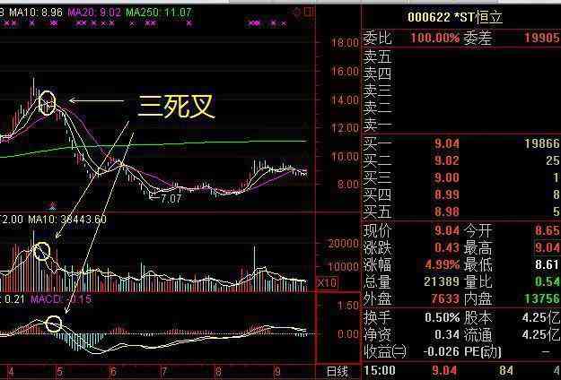三死叉,也就是說當(dāng)股價(jià)均線、成交量均線、MACD指標(biāo)都出現(xiàn)三死叉的時(shí)候,此時(shí)應(yīng)該果斷賣出。看下圖中的st恒立,出現(xiàn)三死叉后股價(jià)一路下滑。