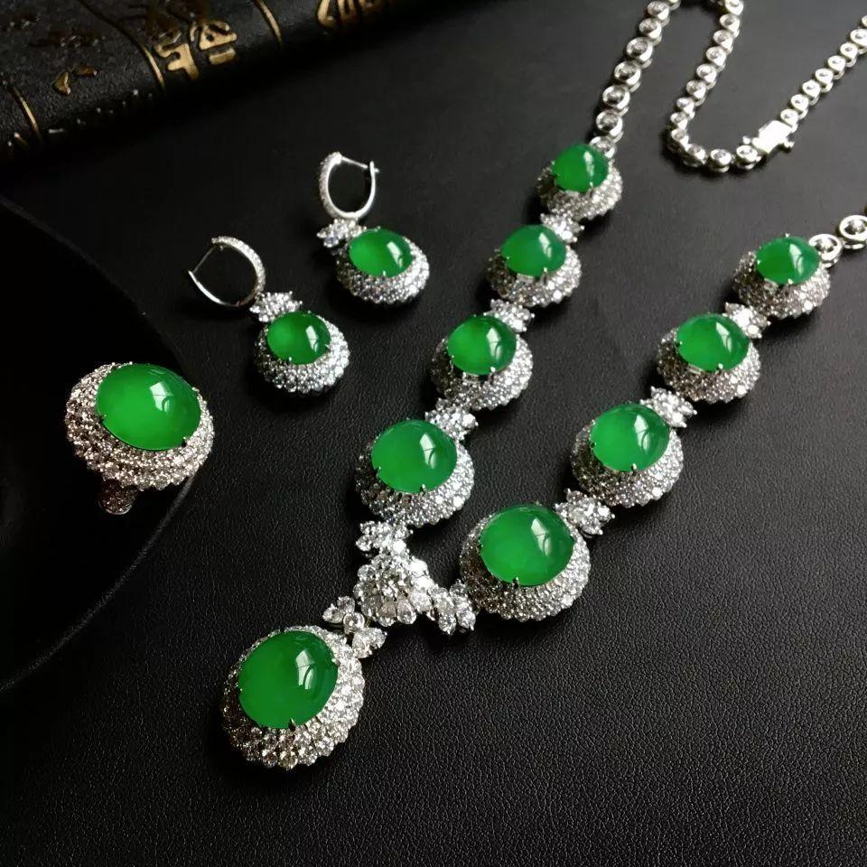 冰種陽綠鑲白金鉆石項鏈/戒指/耳墜