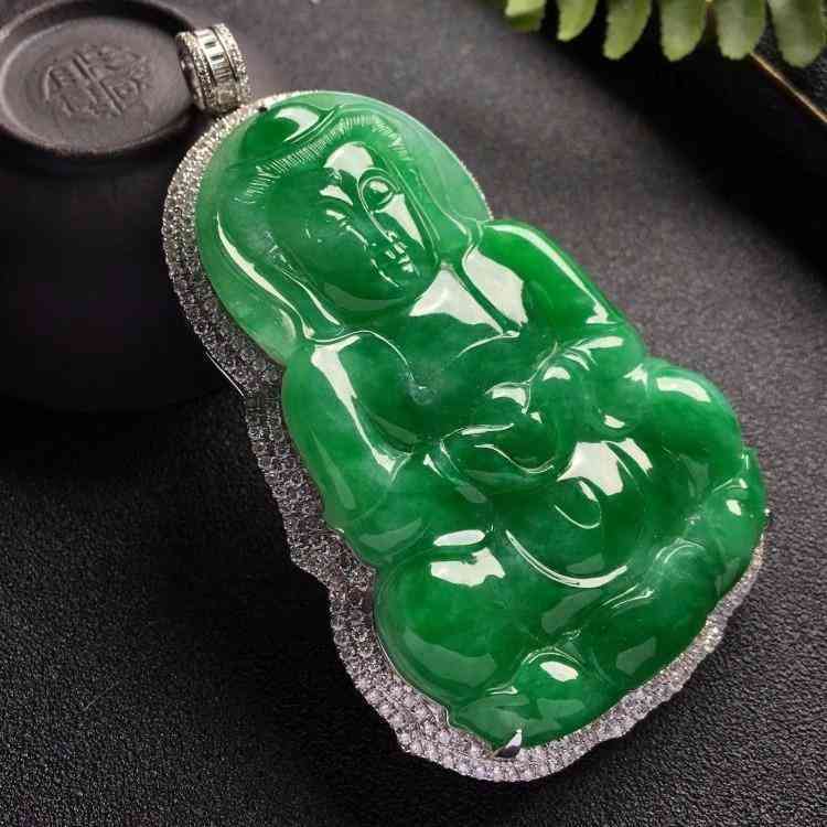 糯冰種正陽綠鑲白金鉆石觀音胸墜