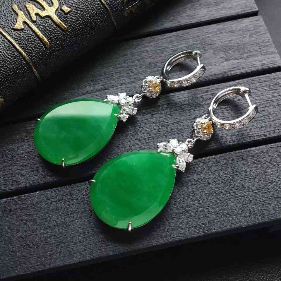 糯冰種翠色鑲白金鉆石水滴耳墜