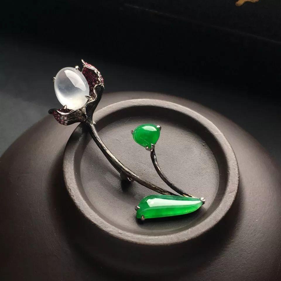 鑲烏金冰玻種無色/糯冰種陽綠一枝獨秀胸針