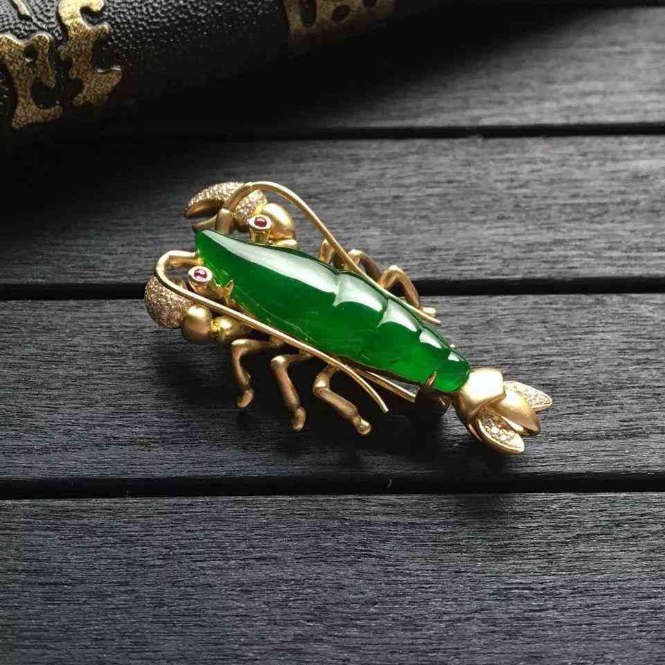 冰種正陽綠鑲黃18k金鉆石玉蝦胸針/胸墜