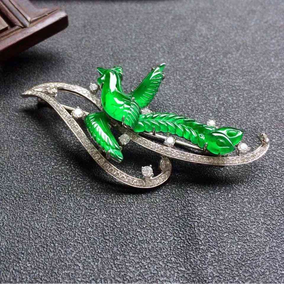 鑲白18K金鉆石冰種陽綠鳳凰胸針