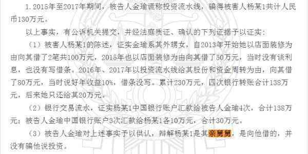 據(jù)其親舅舅楊某1的陳述,金瑜系其外甥女,自2013年開(kāi)始她以店面裝修為由向其借了2筆共100萬(wàn)元,2015年也以店面裝修為由向其借了50萬(wàn)元,當(dāng)時(shí)沒(méi)有談利息,也沒(méi)有寫(xiě)借條。2016年、2017年以投資流水線(xiàn)給其股份和資金周轉(zhuǎn)為由,向其借了80萬(wàn)元,當(dāng)時(shí)說(shuō)好年收益10%,借條沒(méi)寫(xiě)。累計(jì)230萬(wàn)元,四次銀行轉(zhuǎn)賬合計(jì)138萬(wàn)元,后來(lái)她只還給其20萬(wàn)元。而金瑜卻對(duì)上述事實(shí)予以供認(rèn),辯解楊某1是其親舅舅,是向他借的,并沒(méi)有騙他說(shuō)投資。
