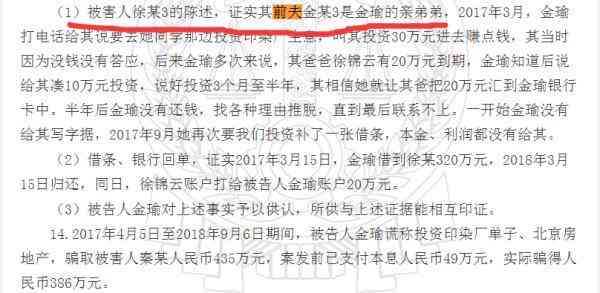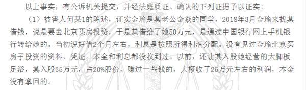 據(jù)刑事判決書(shū)顯示,據(jù)被害人何某1的陳述,金瑜是其老公金焱的同學(xué),2018年3月金瑜來(lái)找其借錢(qián),說(shuō)是要去北京買(mǎi)房投資,于是其借給了她50萬(wàn)元,是通過(guò)中國(guó)銀行網(wǎng)上手機(jī)銀行轉(zhuǎn)給她的。當(dāng)初說(shuō)好借2個(gè)月左右,利息是按照所得利潤(rùn)分配。沒(méi)有見(jiàn)過(guò)金瑜北京買(mǎi)房子投資的資料、憑證。本金和利息都沒(méi)收到過(guò)。以前,還讓其入股她經(jīng)營(yíng)的大腳板足浴,其入股35萬(wàn)元,占20%股份,賺過(guò)一些錢(qián)的,大概收了25萬(wàn)元左右的利潤(rùn),本金沒(méi)有拿回的。