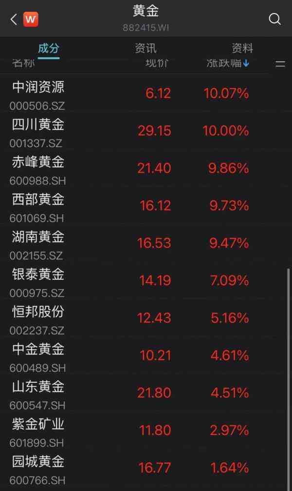 另外,值得注意的是,A股黃金概念板塊也同步飆漲。截至3月20日收盤,中潤(rùn)資源(000506.SZ)、四川黃金(001337.SZ)股價(jià)漲停,赤峰黃金(600988.SH)股價(jià)上漲9.86%、西部黃金(601069.SH)上漲9.73%、湖南黃金(002155.SZ)上漲9.47%。