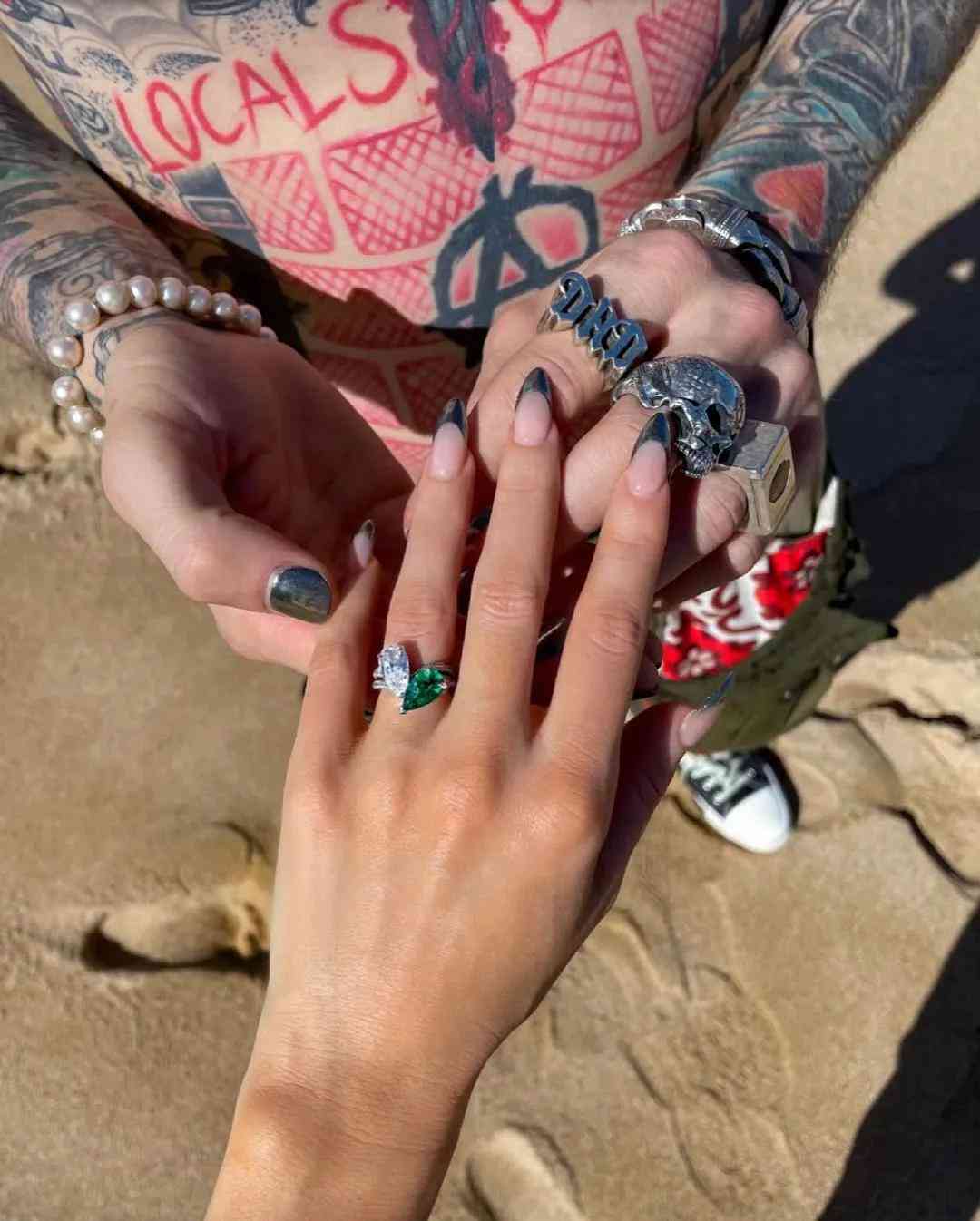 梅根???怂?Megan Fox 自從和槍哥Machine Gun Kelly戀愛后,這對兒情侶就經(jīng)常到處撒狗糧秀愛情。最近槍哥更是向梅根求婚成功,訂婚戒指鑲嵌了一顆碩大的哥倫比亞祖母綠寶石,讓不少網(wǎng)友甚是羨慕,尤其是一些女孩子。令人意想不到的是,這婚戒一旦戴上就很難摘下來,除非暴擊拆除。