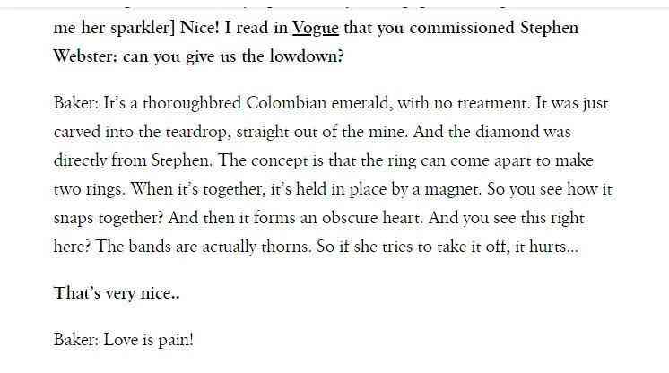 然而,槍哥在接受Vogue采訪時介紹他的訂婚戒指說:“那個戒指實際上是有刺的。因此,如果她敢試圖把它摘下來,就會傷到她自己?!?/p>