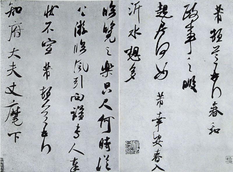 米芾《春和帖》屬行草之作,其中有諸多“得意之筆”,如行“春”字捺畫有明顯隸意,前三列連筆較多,可見(jiàn)米芾心情不錯(cuò)。這些連筆從獻(xiàn)之書中來(lái),行筆中的提按變化極多,如此可以領(lǐng)略米芾“八面出鋒”的功夫。自“想多”二字后,基本上字字獨(dú)立,起筆或頓或尖或側(cè),變化豐富,至“頓首再拜”已經(jīng)有一些飄飄然,筆法上呈現(xiàn)出賣弄意味。最后一行“大夫丈”三字捺畫的變化,得以再次領(lǐng)略米字超妙的筆法。米芾把控能力非常強(qiáng)大,名不虛傳。