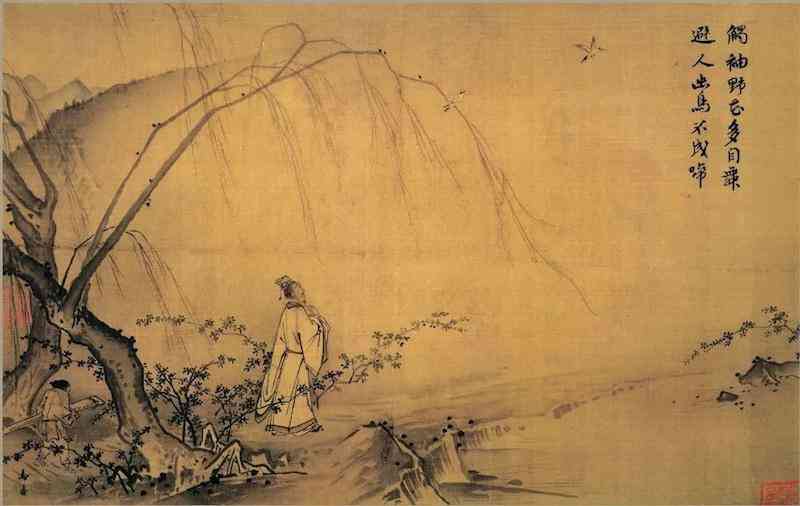 宋 馬遠(yuǎn) 《山徑春行圖》右上角有宋寧宗題詩(shī):“觸袖野花多自舞,避人幽鳥(niǎo)不成啼?!?/p>