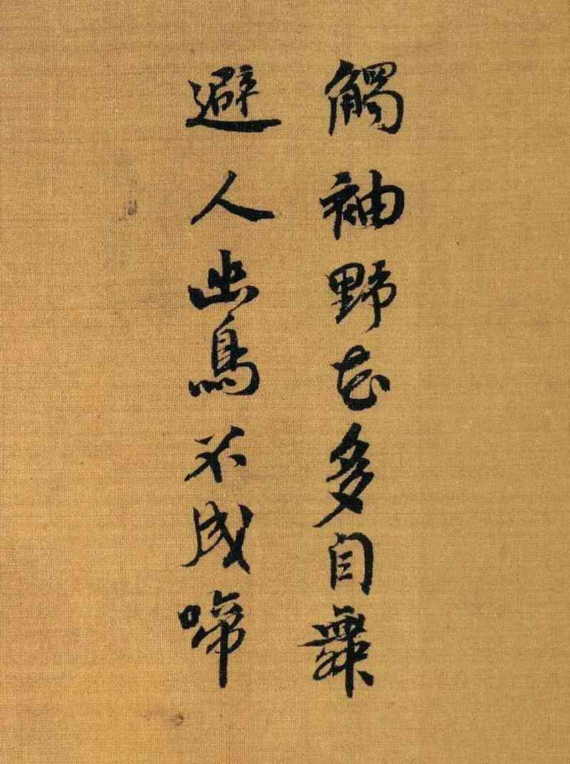 馬遠(yuǎn)《山徑春行圖》預(yù)示了坐久思動(dòng)的心緒。顧名思義,春日美好,漫步山徑,踏歌而行,怡然自樂(lè)。馬遠(yuǎn)與李唐、劉松年、夏圭并稱“南宋四家”,以布局簡(jiǎn)妙、線質(zhì)硬勁而著稱,因其善畫邊角之景,被稱為“馬一角”。這幅《山徑春行圖》所繪即是典型的邊角之景。畫幅頗小,卻留出大片空白,經(jīng)營(yíng)相當(dāng)高明,以虛寫實(shí)、知白守黑。畫幅右上角有一只鳥(niǎo)雀,正展翅飛翔。鳥(niǎo)雀是精煉的工筆,如響箭而鳴,指向遼闊的天空,空白處反增意境。畫中人物悠然自得,緩步而行,似有拈須動(dòng)作,以濃墨桃花點(diǎn)綴的衣飾精致而又不失朦朧之感。筆意簡(jiǎn)潔,由近至遠(yuǎn),漸次虛渺,表現(xiàn)了山中幽深的意境,景隨人移,最后山路消失于盡頭,人之遐思借助畫面空間而寓意深邃。值得稱道的是,宋寧宗墨跡極為少見(jiàn),此處兩句題詩(shī)“觸袖野花多自舞,避人幽鳥(niǎo)不成啼”頗為珍貴,有取法顏米的痕跡,不激不勵(lì),平淡悠遠(yuǎn),大多字獨(dú)立,唯“幽鳥(niǎo)”二字略見(jiàn)連帶,一下子將整個(gè)畫面的意境凸顯出來(lái)了。