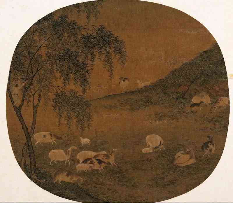 南宋李迪《春郊牧羊圖》大不盈尺,卻展現(xiàn)了一種非常接地氣的生活情趣。此畫也有認(rèn)為是明人所仿。古人之言“郊”,主要指城外、野外。古代吉禮中就有“郊祀”、“郊天”,起源于對(duì)天地的自然崇拜。圖繪郊外有羊數(shù)只,展現(xiàn)奔走俯首等多種姿態(tài),刻畫生動(dòng),栩栩如生,或白或花,或臥或立,有母子舐?tīng)偾樯?、有結(jié)伴奔跑嬉戲、有獨(dú)自悠閑覓食,地上綠草茵茵,右側(cè)斜坡野草茂盛,實(shí)乃牧羊的好去處。左側(cè)二棵樹(shù)交叉矗立,一樹(shù)杈上的牧童舉著棍子似在挑逗上方的小鳥(niǎo),調(diào)皮可愛(ài)的天性一覽無(wú)余,給安靜的畫面增添了生趣。