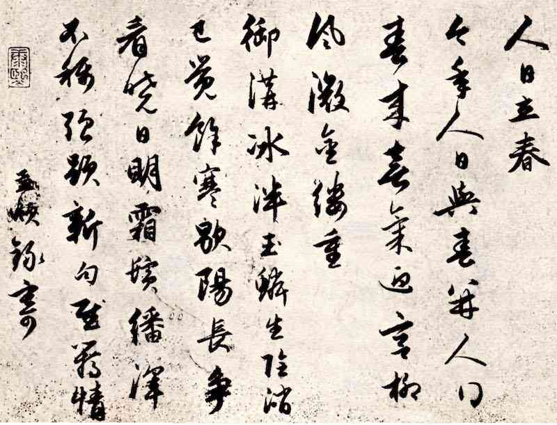 在藝術(shù)史分期中,宋元往往并列,關(guān)鍵紐帶無(wú)疑是趙孟頫。趙氏有《人日立春》冊(cè)頁(yè)傳世,其中寫道:“今年人日與春并,人得春來(lái)喜氣迎。宮柳風(fēng)微金鏤重,御溝冰蚌玉鱗生。陰消已覺(jué)余寒散,陽(yáng)長(zhǎng)爭(zhēng)看曉日聽(tīng)。霜鬢彩幡渾不稱,強(qiáng)題新句慰羈情?!薄叭巳铡焙汀傲⒋骸敝丿B,殊為難得。唐代詩(shī)人盧仝也有《人日立春》詩(shī):“春度春歸無(wú)限春,今朝方始覺(jué)成人。從今克己應(yīng)猶及,愿與梅花俱自新。”此札最末有“孟頫錄寄”四字。由此來(lái)看,這是趙孟頫乘興賦詩(shī)一首,而后寄給摯友的尺牘。用筆輕靈生動(dòng),與他平時(shí)所作的厚實(shí)飽滿風(fēng)格有所區(qū)別。筆斷意連之處甚多,有的不經(jīng)意之時(shí),就出現(xiàn)連筆,如左上角兩列,按照說(shuō)并列兩行相同的位置,應(yīng)該有所區(qū)別,但情緒到了,也是勢(shì)不可擋。