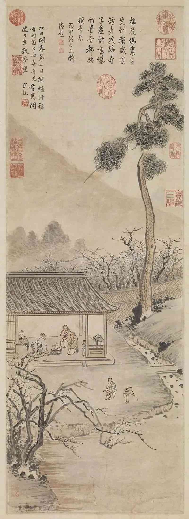 明代顧正誼所繪《開(kāi)春報(bào)喜》,一個(gè)“開(kāi)”字,畫龍點(diǎn)睛,春回大地,萬(wàn)物復(fù)蘇,一個(gè)“喜”字,寫盡了心性變化,既上眉頭、又上心頭。整幅畫面設(shè)色淡雅明亮,樹(shù)木、人物造型簡(jiǎn)練。屋內(nèi)高士拱手圍火爐取暖,爐內(nèi)正燙著酒壺,童仆侍于側(cè)。戶外兒童燃放鞭炮,嬉戲于庭院廊間。屋后長(zhǎng)松、紅白梅花盛開(kāi)??钭诸}:“此日開(kāi)春日,擁爐情話有村翁。予心喜與兒童異,聞道占年谷麥豐?!闭麻_(kāi)春日,期盼著一年的風(fēng)調(diào)雨順、谷物豐收。要說(shuō)顧正誼在畫壇之名位,僅憑董其昌曾得其指授這一點(diǎn),就足見(jiàn)分量。董氏有評(píng):“吾郡畫家,顧仲方中舍最著。其游長(zhǎng)安,四方士大夫求者填委,幾欲作鐵門限以卻之,得者如獲拱璧?!?/p>