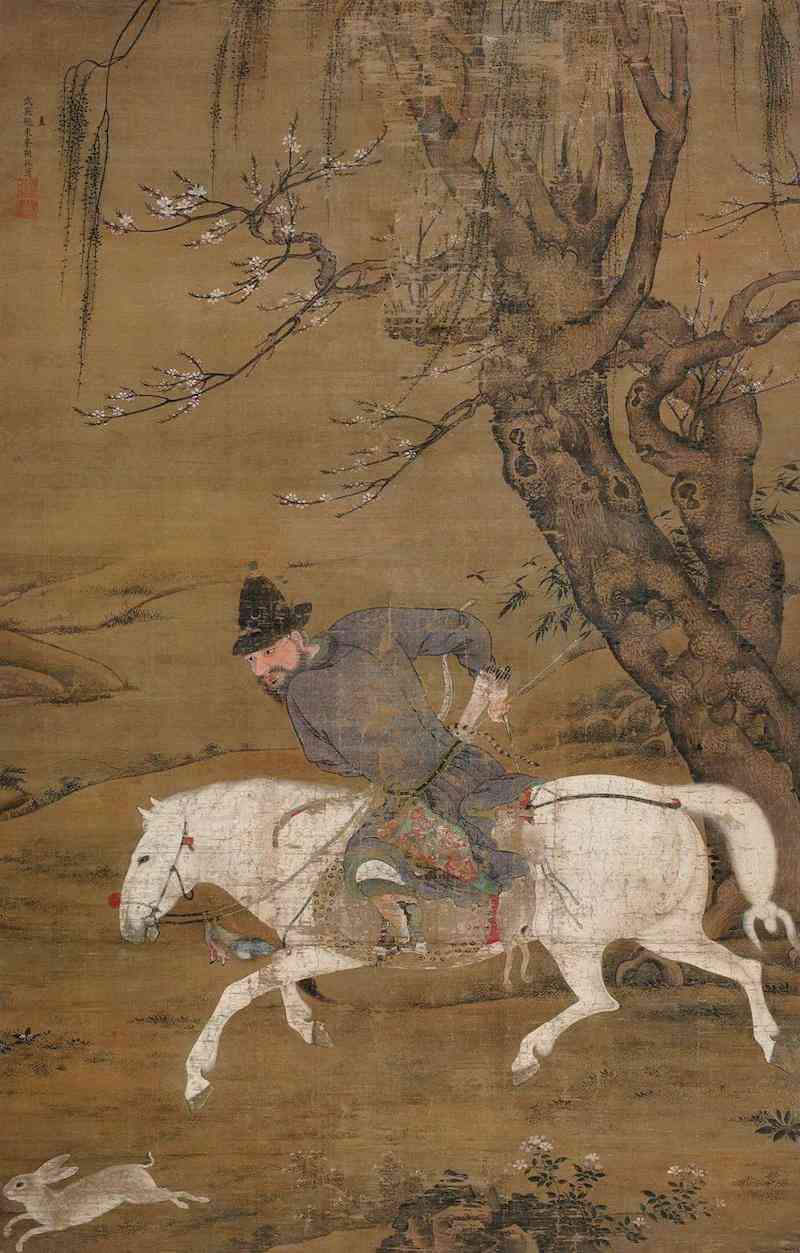 胡聰是一位宮廷畫家。創(chuàng)作于明宣德時(shí)期的《春獵圖》,不僅尺幅巨大,構(gòu)圖更是別開(kāi)生面,屬于精致細(xì)膩院體風(fēng)格。圖中的人物和馬匹高度寫實(shí),但又給人十足的想象空間。所謂秋高羊肥,而到了冬春交替之際,動(dòng)物相對(duì)羸弱困頓。當(dāng)春意萌發(fā),動(dòng)物和人類似,也想活動(dòng)一下筋骨,正是狩獵的最佳時(shí)機(jī)。圖中騎者身份尊貴,頭戴大帽,身著裘皮,姿態(tài)矯健,馬匹裝飾華麗,此時(shí)一邊緊盯著前方驚起的野兔,一邊正拔出羽箭,準(zhǔn)備彎弓射出,畫面寫實(shí),栩栩如生,宛如場(chǎng)景再現(xiàn)。