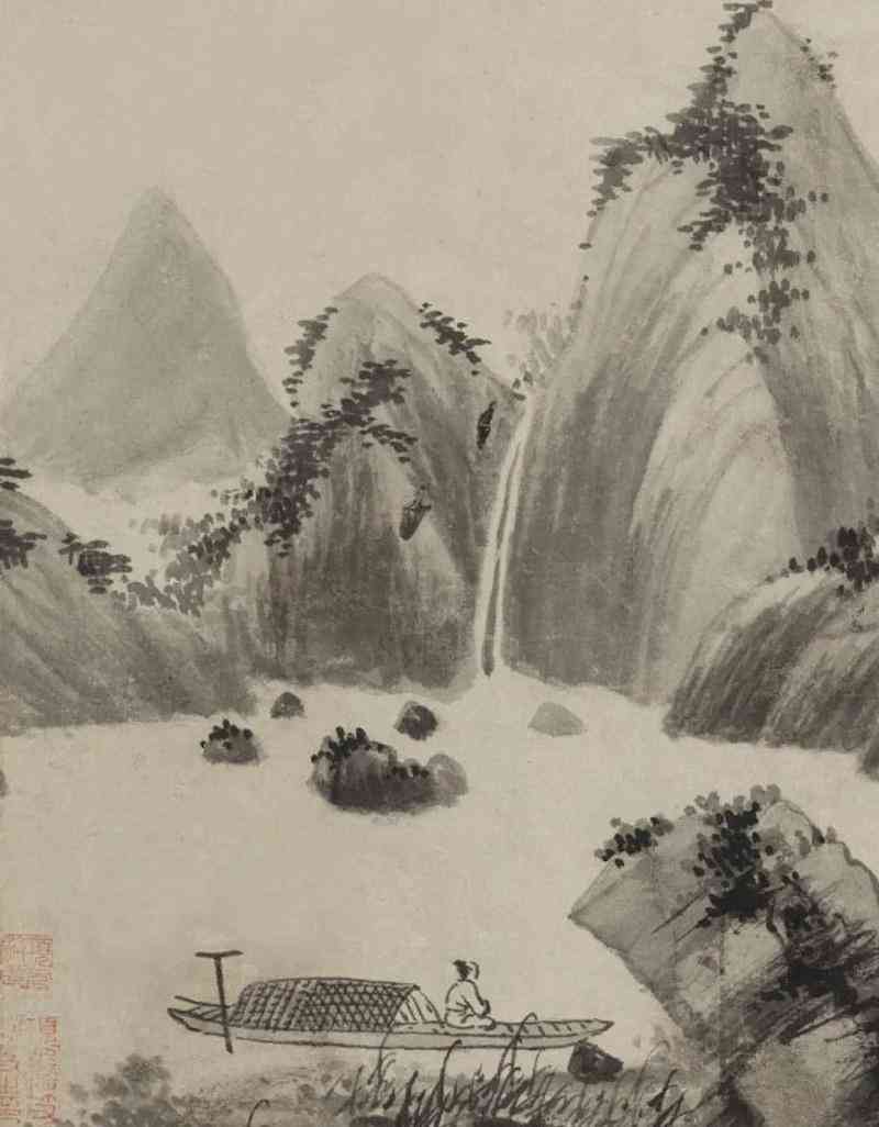 姚綬《春山扁舟圖》呈現(xiàn)出“泉高波遠(yuǎn)蕩扁舟, 潭深水清意味稠。山仁水智藏真趣, 無(wú)窮妙諦堪探求?!币辉?shī)所描繪的意境。姚綬畫學(xué)“元四家”,尤得吳鎮(zhèn)精髓,寫此江南小景,構(gòu)圖平實(shí),筆墨厚凝重樸,簡(jiǎn)約而不空疏,元?dú)饣鞙S,平崗疏樹(shù),水天空闊,一士人泛舟垂綸于淺灘蘆荻之間,滌盡紅塵,忘情山水,悠閑超脫,了無(wú)俗韻,氣象高華而有靜穆之致。姚綬工書,尤擅楷書和行書,行書師法魏晉,追慕鐘繇、王羲之,而后兼取蘇軾、張雨,風(fēng)格淡雅勁婉與勁健婉和兼得。姚綬入仕甚遲而又忙于政務(wù),無(wú)暇顧及書畫,直到被謫貶至江西永寧知府,而后辭官歸里,過(guò)起隱居生活,專注于書畫。筑書齋名之曰“丹丘”,自稱丹丘生——唐玄宗時(shí)著名隱君,姚綬慕其名而自比之,更加以效仿。明成化十三年(1477)五月,取黃庭堅(jiān)“滄江靜夜虹貫月,定是米家書畫船”詩(shī)意造游船一艘,冠名“滄江虹月舟”,從此載著文房四寶,泛舟于吳越山水間,彈琴吹簫,書畫吟詠,旁人視之皆以為神仙。