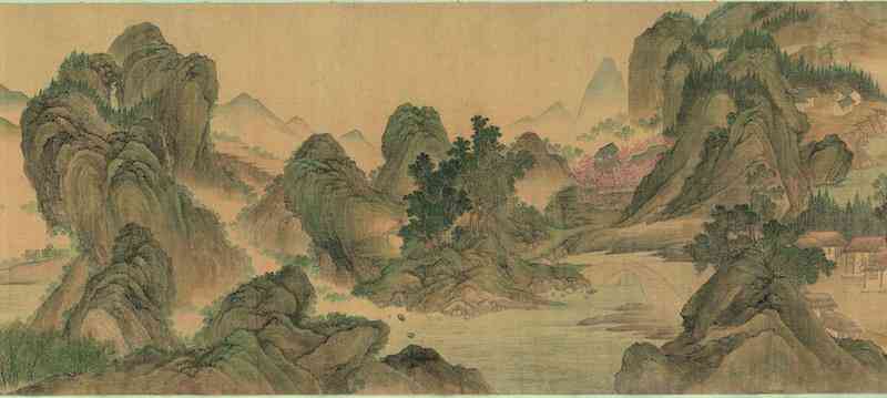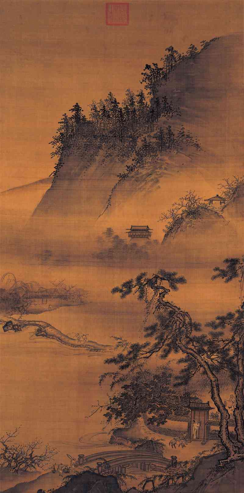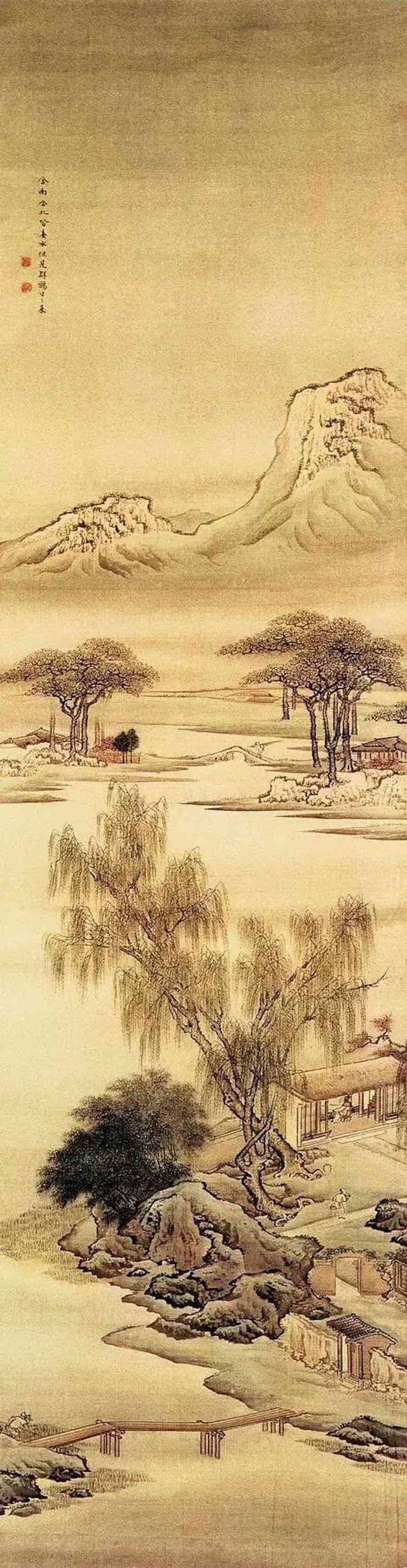 明戴進(jìn)《春游晚歸圖》主要取法南宋馬遠(yuǎn)、夏圭一派,不為成法所拘,自踐新意。構(gòu)圖雖沿襲南宋院畫體系風(fēng)格,保留了大部分空虛之處,然畫面整體上比較平,近景與遠(yuǎn)山幾乎在同一平面,這正是“浙派”繪畫的特點(diǎn)之一。戴進(jìn)是畫史中正式命名的個(gè)畫派——“浙派”的創(chuàng)始人。畫面左下角為前景,有一座掩映于樹(shù)林之中的莊院,伸出墻外的樹(shù)枝與路邊的桃花透露出春天的氣息。一人正在敲門,庭院中有仆人正忙著提了燈籠前來(lái)準(zhǔn)備開(kāi)門,顯示出主人春游晚歸之意。中景的田野小徑,兩個(gè)農(nóng)人正扛著鋤頭回家,遠(yuǎn)處農(nóng)舍的空地上,有農(nóng)婦正在喂食家禽。人物很小,顯示出畫家對(duì)細(xì)節(jié)的把握,技法功力深厚,變化多端,奔放中不失法度,嚴(yán)謹(jǐn)中又富有瀟灑俊逸的格調(diào)。