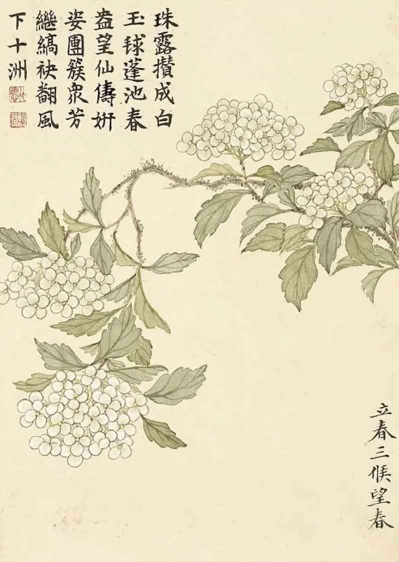 清代宮廷畫家董誥于山水、花鳥(niǎo)無(wú)一不精,繪就“二十四番花信風(fēng)圖”。所繪立春“三候”:一候迎春、二候櫻桃、三候望春。畫上題詩(shī)分別為:“嫩黃拓纈色鮮新,帶雪凝煙糝玉塵。喜應(yīng)東風(fēng)候,迎來(lái)錦繡上林春。”“初韶入律吐繁英,料峭香舒碧葉縈。小圃春光敷駘蕩,紫霞飛雨濯姿清?!薄爸槁稊€成白玉毬,蓬池春盎望仙儔。妍姿團(tuán)簇眾芳繼,縞袂翻風(fēng)下十洲。”傳聞董誥書法宗“二王”,能于一粒芝麻上書“天下太平”四字,以此技法作畫,必定異常精到。不難看出,董誥的沒(méi)骨畫,嬌艷動(dòng)人,作品筆觸工整精微,設(shè)色淡雅秀逸,畫面清雅素潔,書卷氣濃厚,畫如其人,人如其畫,讓人愛(ài)不釋手。