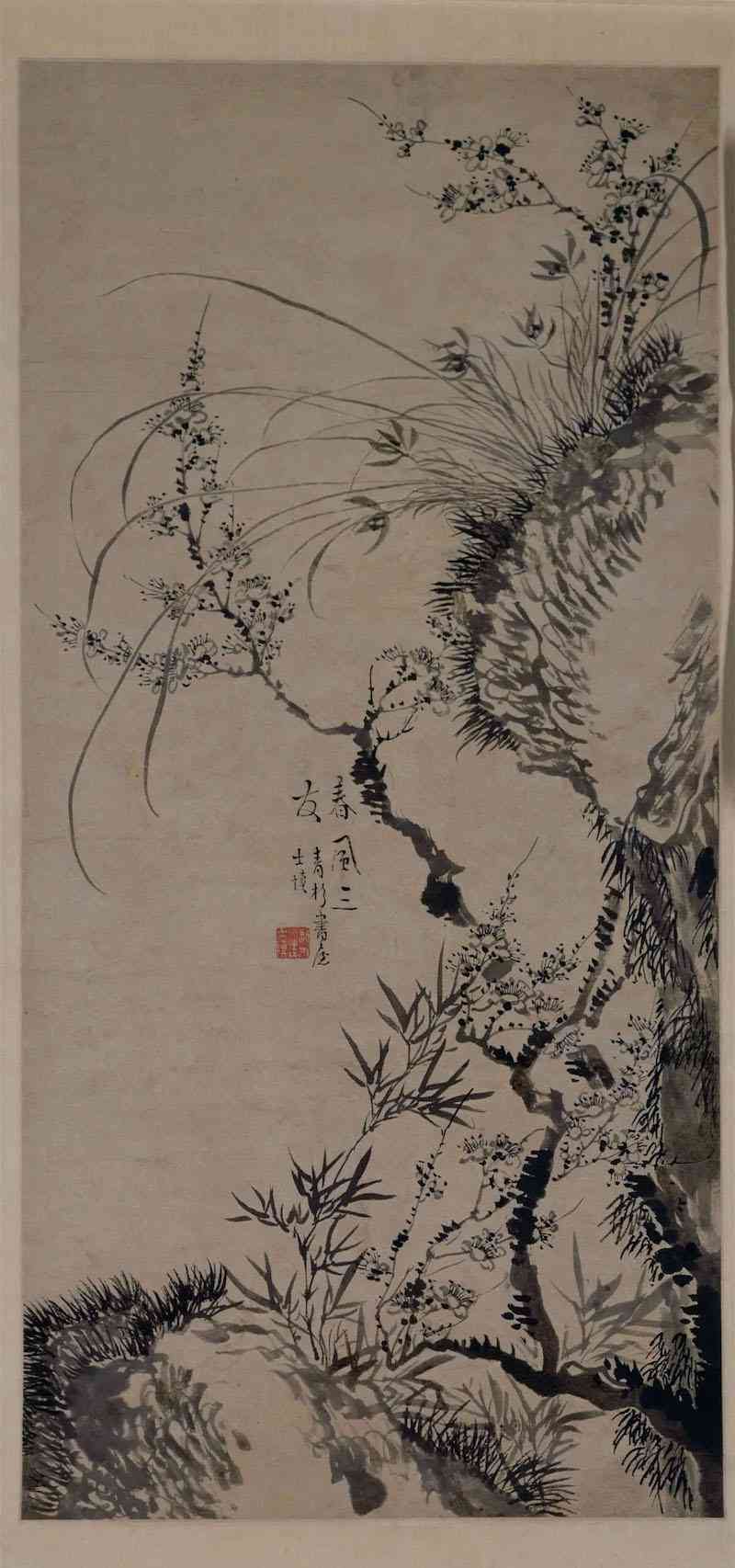 汪士慎《春風(fēng)三友圖》所寫乃春天山間蘭梅盛開(kāi),新篁抽發(fā)的情景,經(jīng)過(guò)畫家的經(jīng)營(yíng),梅蘭竹濃淡相襯。用筆瘦硬遒勁,揮灑舒放,自然天成?!按悍秩选笨钭謱懺诋嬅嬷行?,成為“活眼”,看似隨心所欲之處,其實(shí)是匠心經(jīng)營(yíng)。汪士慎的梅花,不管“繁枝”還是“疏枝”,都畫出了高人逸士的冷峻和清氣,“雪盡南枝香夢(mèng)醒,欣欣顏色向春風(fēng)。”在“揚(yáng)州八怪”中,汪士慎最為淡泊,“白頭蒙見(jiàn)重,無(wú)志謁公侯”。汪士慎三十多歲時(shí),憑借書畫之長(zhǎng)來(lái)?yè)P(yáng)州謀生,“懶向長(zhǎng)官垂組綬,愛(ài)從野客話煙霞”。年近半百時(shí),才靠賣畫掙來(lái)的錢在揚(yáng)州買了一處老房子,于是又成了“窮光蛋”。他本想布衣蔬食,品茗讀書,寫字作畫,平平淡淡地生活,然而就在那一年,患上眼疾,沒(méi)錢求醫(yī)問(wèn)藥,只能忍受著眼疾的煎熬。為了生計(jì),還得不停地作畫。書畫家之艱辛,絕非想象中的名利雙收,愜意無(wú)比。