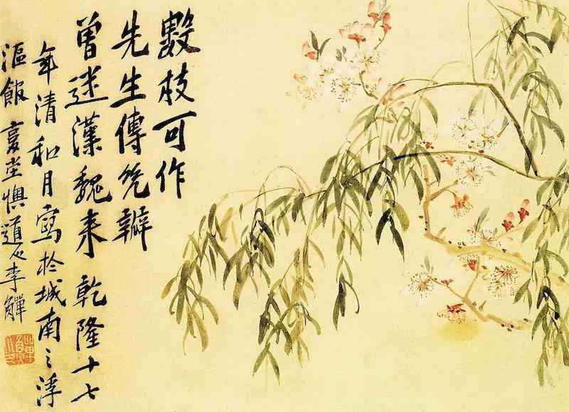 同屬“八怪”的李鱓也有一副關(guān)于春天的畫作。《桃花春柳》描繪了典型的春天物象。筆色濕潤(rùn)雋秀,色彩和諧清新,筆意不落俗套??钭诸}:“數(shù)枝可作先生傳,幾瓣曾迷漢魏來(lái)。”詩(shī)句明白無(wú)誤地流露出李鱓對(duì)陶淵明《桃花源記》的推崇。“乾隆十七年清和月寫于城南之浮漚館”這句話,可以看出李鱓的處境,時(shí)年67歲。柳樹(shù)發(fā)芽,因地域的不同自南而北,由早及晚,但無(wú)論什么地域,柳樹(shù)一定是所有樹(shù)木中最早感受到春天的。桃花作為較早感受到春天的花卉,常常被和柳樹(shù)結(jié)合在一起,表現(xiàn)春天。在李鱓經(jīng)營(yíng)的畫面中,楊柳和桃花既形成有趣的對(duì)比,又和諧融為一體。題字雖然較滿,幾乎占到畫面的三分之一,卻是有機(jī)的部分。做過(guò)滕州知縣的李鱓深諳北方春色,來(lái)到揚(yáng)州,又能體驗(yàn)?zāi)戏降拇禾欤@然不同于惲壽平筆下的江南春天。