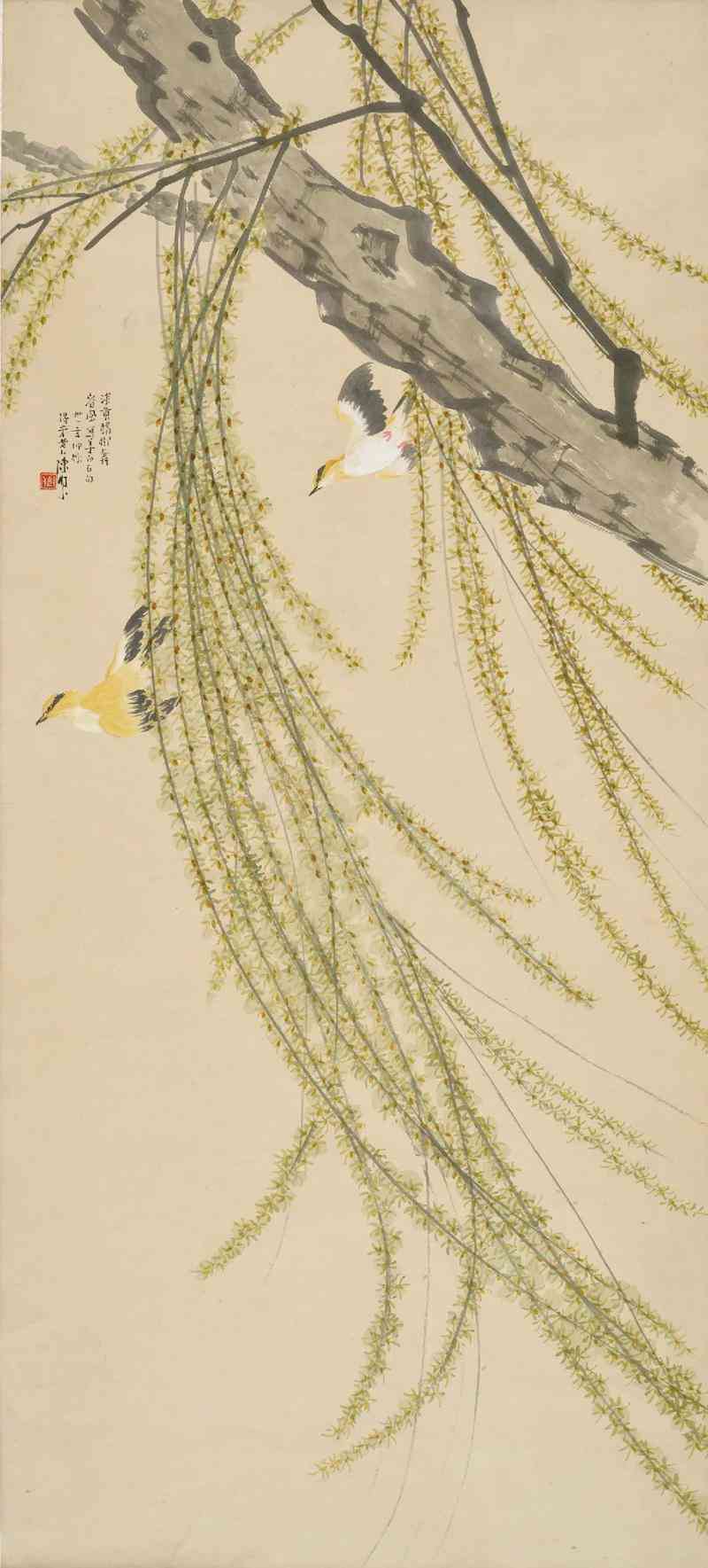 近代陳樹(shù)人《春柳》風(fēng)格明顯不同。筆墨與構(gòu)圖盡顯畫家率真、寫意之風(fēng),將南國(guó)美麗迷人的景象展露得惟妙惟肖,春意盎然。中國(guó)地域廣大,北方之北還有北方,南方之南還有南方。楊柳枝條很長(zhǎng),綴滿細(xì)碎的小花,兩只鳥(niǎo)兒俯視朝下,使得整個(gè)畫面變得靈動(dòng)起來(lái)??铑}姜白石“淡黃楊柳舞春風(fēng)”,時(shí)1942年,功力已大成。陳樹(shù)人是“嶺南畫派”創(chuàng)始人之一,從政之余經(jīng)營(yíng)繪畫,成就全面,山水、花鳥(niǎo)、走獸等皆著稱于時(shí),畫風(fēng)清新、恬淡、空靈,獨(dú)樹(shù)一幟。