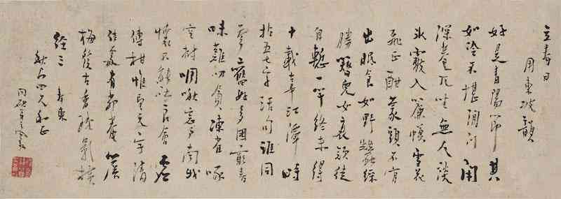高翔和汪、李同屬“揚(yáng)州八怪”。所作《立春日》橫幅寫道:“好是青陽(yáng)節(jié),其如冷不堪。閑門閉深巷,兀坐無(wú)人談。冰霰入簾幙,雪花飛正酣。蒙頭不肯出,眠食如野蠶?!痹?shī)意蒼涼,全無(wú)春色來(lái)臨之喜。此幅書風(fēng)格調(diào)冷逸荒寒,可見(jiàn)個(gè)人心境,字形以極瘦縱長(zhǎng)為主,如開(kāi)篇“春”字,捺畫所為點(diǎn),“日”部豎畫斜放,一下子欹側(cè)成勢(shì)。此類處理方法比比皆是,如第二行“韻”字的左右錯(cuò)落,筆畫取縱勢(shì),獨(dú)具一格,偶有筆法與鄭板橋接近,營(yíng)造出趣味性,第十三行“窮”字寶蓋頭拉長(zhǎng),本應(yīng)取橫勢(shì),但因?yàn)辄c(diǎn)畫太遠(yuǎn),仍然感覺(jué)是縱勢(shì),第十四行“貪”字的捺畫收縮,亦是此法,大可玩味。