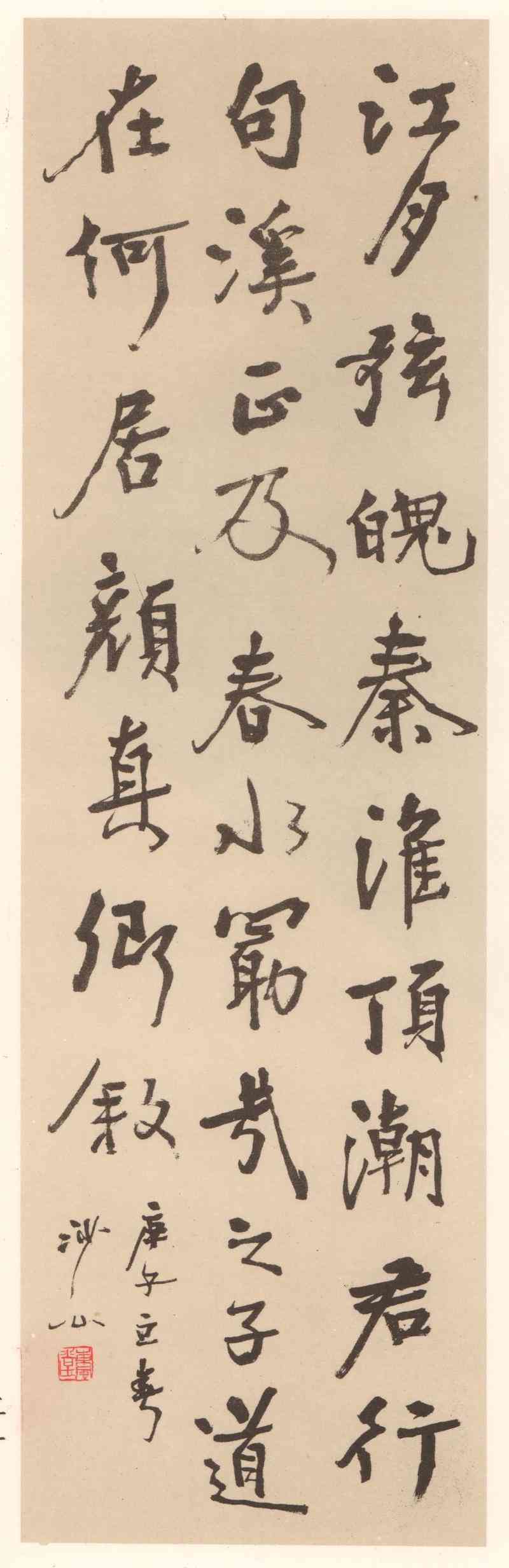 胡小石雖被稱為“南京四老”之一,實(shí)源于“海派”李瑞清。所臨顏真卿《送劉太沖序》,作于庚子立春——去世前一年,正當(dāng)人書俱老之時(shí),長(zhǎng)槍大戟、縱橫捭闔,大家風(fēng)范。胡氏臨作,因?yàn)閭€(gè)人風(fēng)格成熟早且個(gè)性強(qiáng)烈,多半自出己意。然此作卻最大程度上接近范本,如開(kāi)篇的“江月”二字正欹相生,“秦”字捺畫收筆,以及中行的“水”字,最末的“顏真卿”三字,是極為忠實(shí)范本的。此作北碑意趣甚濃,以魏寫唐,別見(jiàn)生趣。