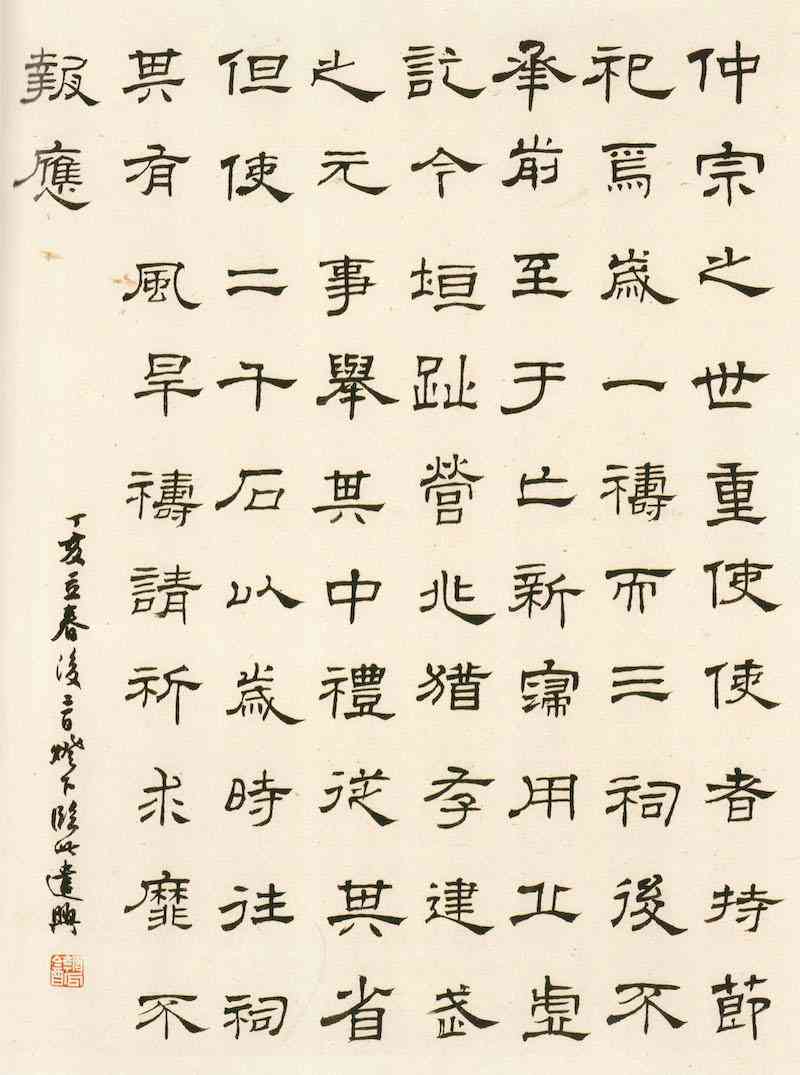 沈尹默臨作時(shí)在1947年,65歲,讀款字“燈下臨此遣興”,說(shuō)明是深夜進(jìn)行的臨池功課,極為勤奮,至老不輟。沈尹默一生主攻褚楷,乃世所公認(rèn),沈臨《禮器》,亦有助于體悟褚楷,觀此臨作,筆法和結(jié)字不免有振蕩之處,可見(jiàn)其并不擅長(zhǎng)隸書,尤其是落款與隸書正文不太融洽??陀^地說(shuō),沈尹默的才華和成就主要在楷書及行書。