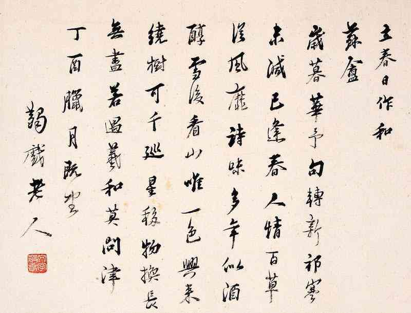 馬一浮《立春日作和蘇盦》寫道:“歲暮華予句轉(zhuǎn)新,祁寒未減已逢春。人情百草從風(fēng)靡,詩(shī)味多年似酒醇。雪后看似色,興來(lái)繞樹(shù)可千巡。星移物換長(zhǎng)無(wú)盡,若遇羲和莫問(wèn)津?!笨钭钟小岸∮吓D月既望”字眼,很顯然,這是抄錄時(shí)間,詩(shī)作于立春日。馬一浮書法受沈曾植影響很大,然字形絕少連帶,枯淡濃潤(rùn)一任自然,將章草筆法化為無(wú)痕,書卷氣洋溢字里行間,恬淡之風(fēng)令人賞心悅目,感懷不已。一代大儒,落筆不凡,時(shí)年已75歲,仍是元?dú)饬芾臁?/p>