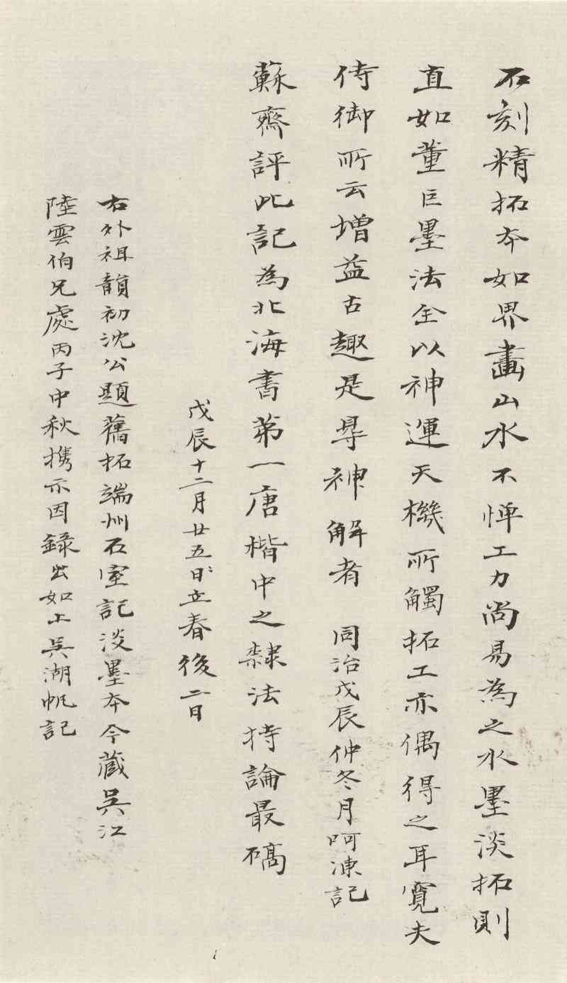 吳湖帆題李邕《端州石室記》錄:“石刻精拓本如界畫山水,不憚工力,尚易為之。水墨淡拓則直如董、巨墨法全以神運(yùn),天機(jī)所觸,招工亦偶得之耳。寬夫侍御所云增益古趣,是得神解者?!K齋評(píng)此記為北海書,唐楷中之隸法,持論最碻?!边@段題跋有三個(gè)時(shí)間,其中有一個(gè)是“戊辰十二月廿五日立春”,最關(guān)鍵的是后來(lái)補(bǔ)上的一句話:“包安吳楷書,人謂從北魏碑出,實(shí)不知自北海此記來(lái)也”,發(fā)他人之所未發(fā)。吳湖帆的書法精美雅致,全是帖學(xué)風(fēng)韻。綜合來(lái)看,小字勝過(guò)大字。大字行筆粗重,加上字形多四平八穩(wěn),難免少了情味。相比之下,題跋小字細(xì)膩精到,用筆輕靈飄逸,且具有碑刻意蘊(yùn),屬于獨(dú)特的“碑帖相融”——得力于精嚴(yán)的唐碑,而不是恣肆野逸的北碑,別見(jiàn)風(fēng)范。收藏豐富,眼界開(kāi)闊,見(jiàn)解獨(dú)到。