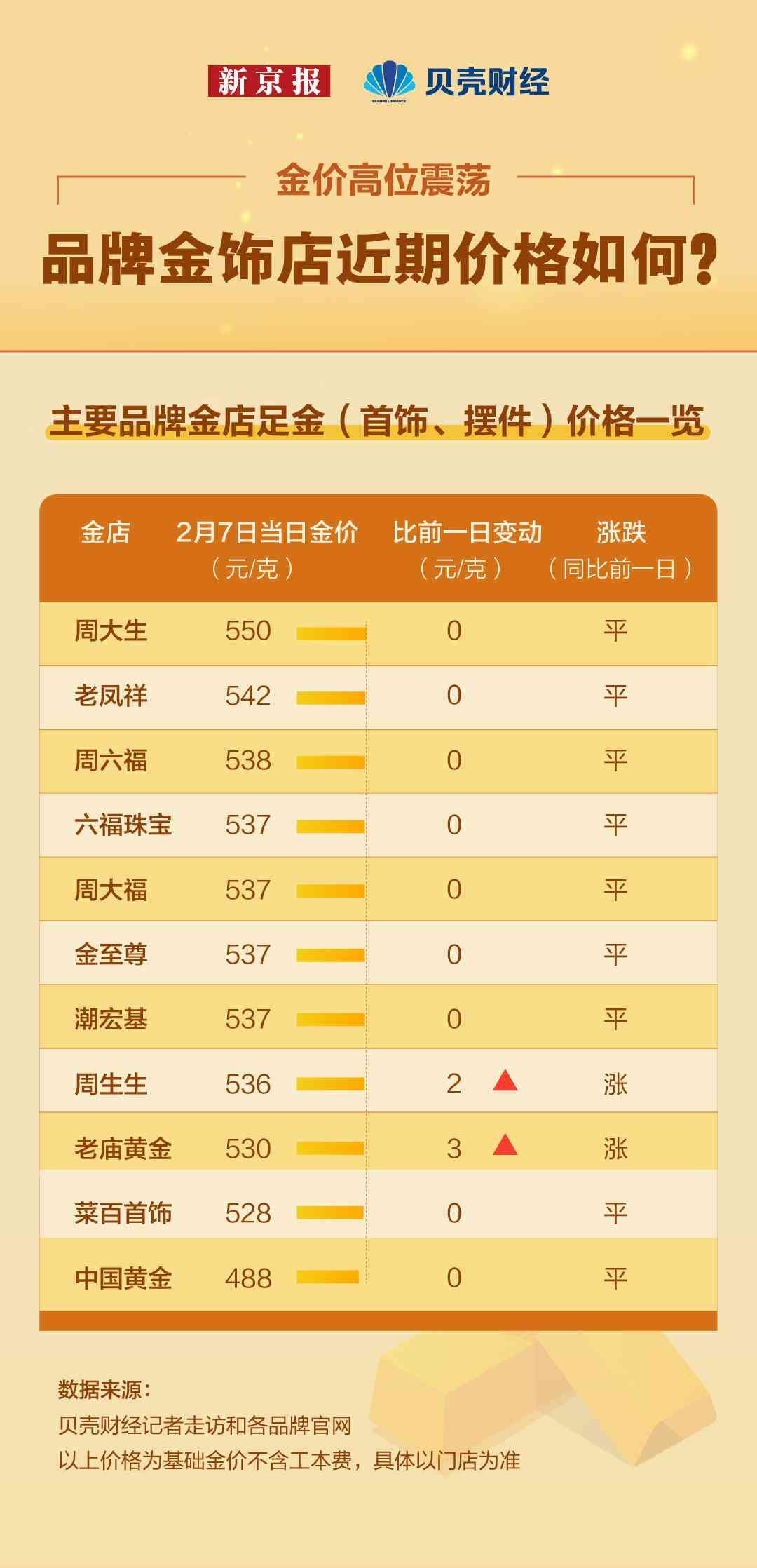 2月7日,貝殼財經(jīng)記者走訪發(fā)現(xiàn),品牌金飾店金價基本在488-550元之間。金價最高的金店是周大生珠寶,當(dāng)日報價550元/克。