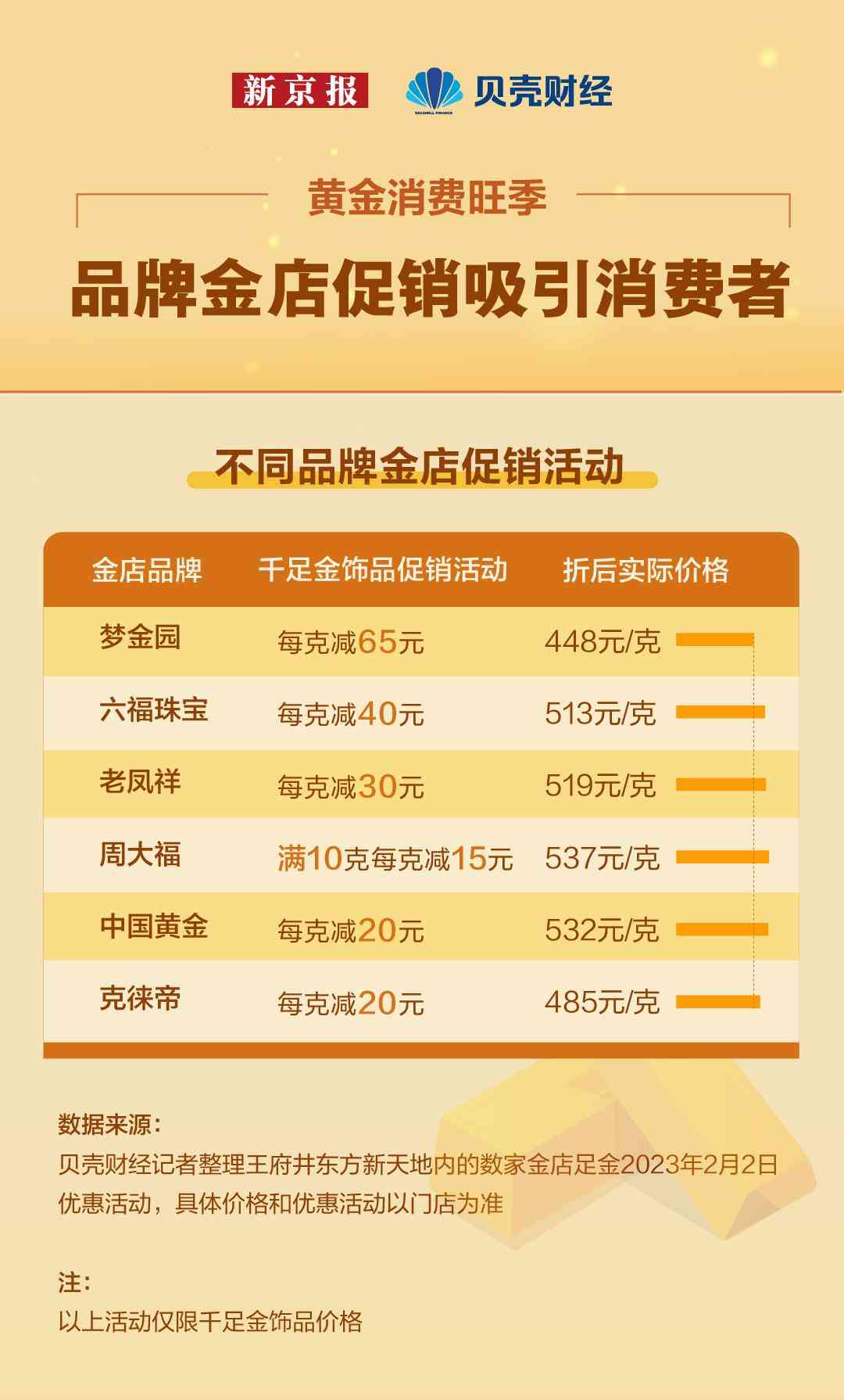 2月初,貝殼財經(jīng)記者走訪北京王府井商圈多家金店發(fā)現(xiàn),多家金店報價超過500元/克,但大多有“克減”活動,實際購買價格略有優(yōu)惠,商家抓住春節(jié)期間傳統(tǒng)旺季這種消費需求,推出購物滿減、購物贈禮、返券等一系列促銷活動,吸引黃金消費者進(jìn)一步增長。