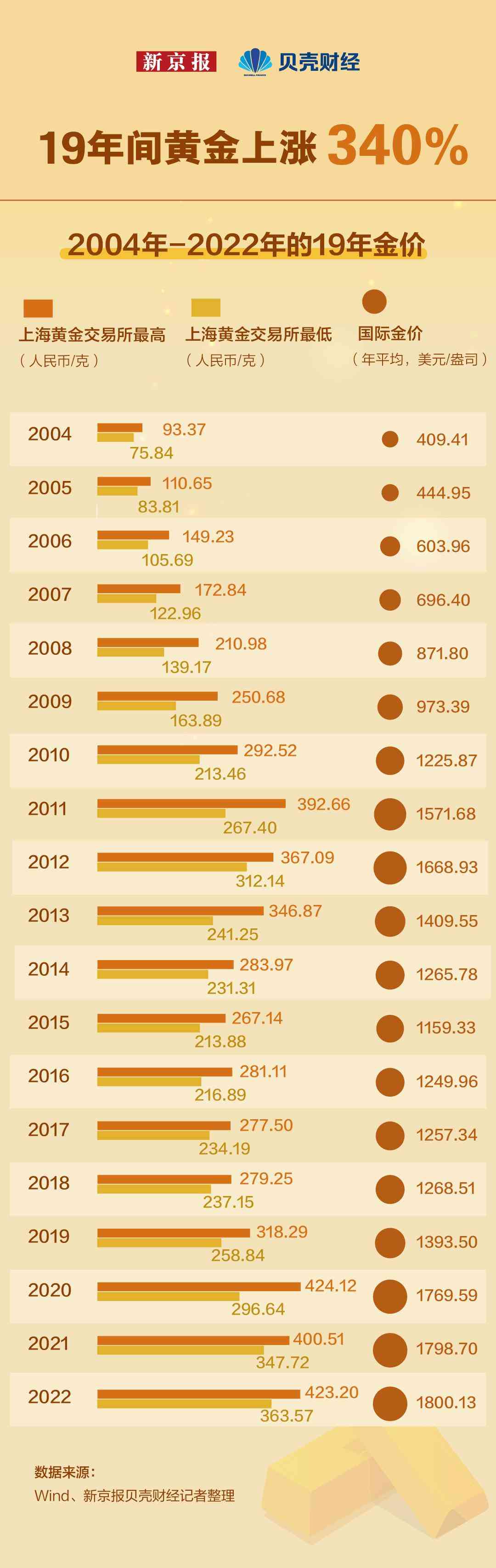 從2001年開始,黃金經(jīng)歷10年的大牛市,貝殼財經(jīng)記者梳理2004年至2022年的國際金價(年平均)發(fā)現(xiàn),在這19年間黃金上漲了340%。