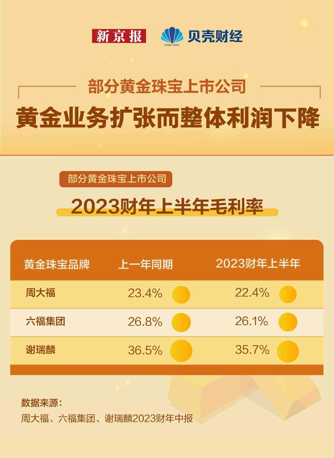 六福集團2023財年中報也稱,由于金價下跌帶動黃金銷售氣氛良好,本集團整體毛利率因黃金銷售占比增加而輕微下降。謝瑞麟則在2023財年中報也提到,金價下跌致香港黃金產(chǎn)品需求有鼓舞性增長,記者梳理謝瑞麟財報發(fā)現(xiàn),其整體毛利潤相比上一個財年也有所下降。這與謝瑞麟中國內(nèi)地珠寶銷售不景氣有關(guān)。