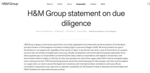 近日H&M集團發(fā)布聲明,稱H&M集團對來自民間社會組織的報告和媒體的報道深表關注,其中包括對新疆維吾爾自治區(qū)少數(shù)民族“強迫勞動”和“宗教歧視”的指控。聲明中,H&M集團表示,不與位于新疆的任何服裝制造工廠合作,也不從該地區(qū)采購產(chǎn)品/原材料。