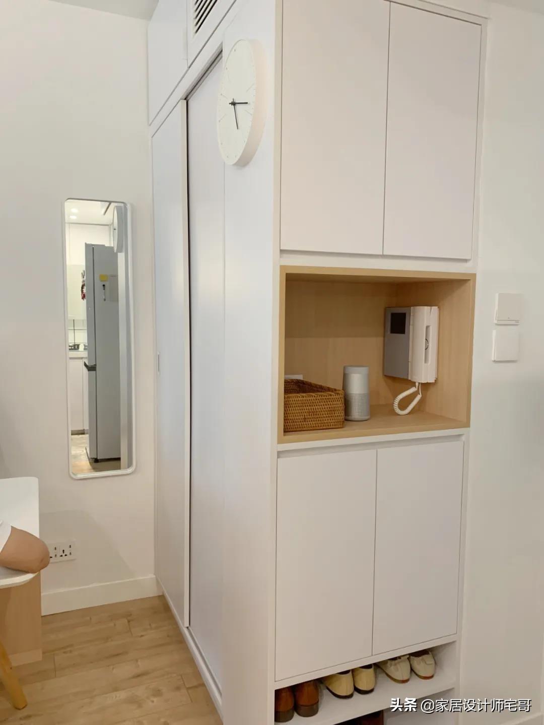 另一側面向客廳的一面是衣柜,用來收納進門后換下的外套、包包等物品,旁邊的墻面上還有一面穿衣鏡,出門時可以整理著裝。