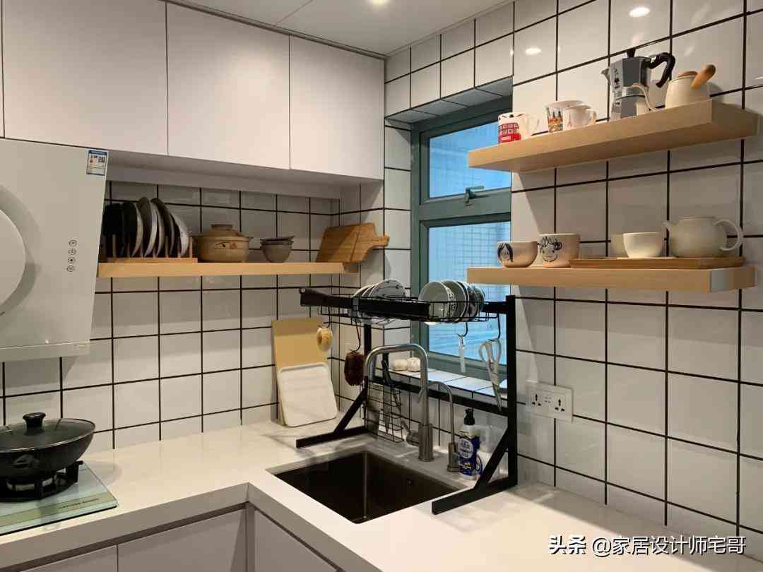 廚房內上下的柜子是白色,而中間則貼滿了小方磚,加上黑色的美縫搭配,簡約大氣。