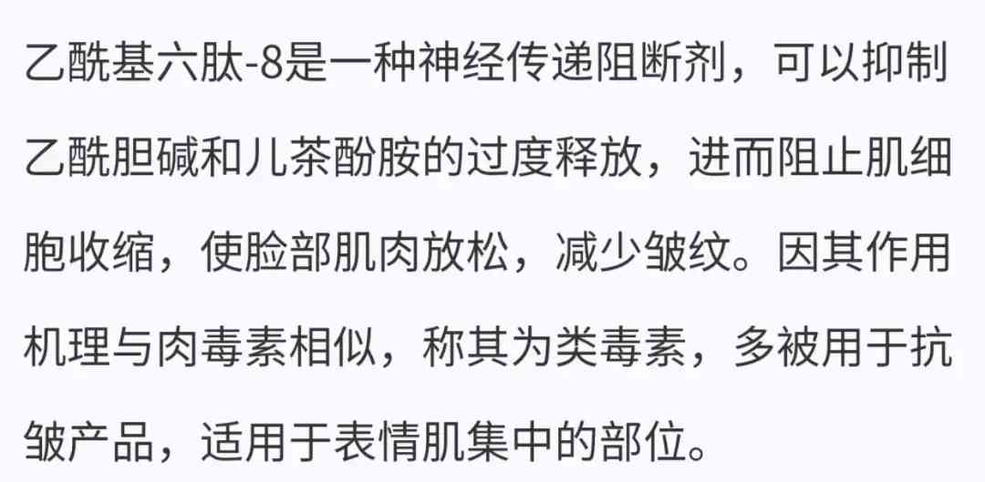 說白了就是類似肉毒桿菌,能舒緩頸紋、抬頭紋、魚尾紋啥的動態(tài)皺紋。