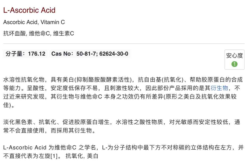 抗壞血酸,其實就是咱們常說的維生素C,是抗氧化美白的扛把子。維生素C的結構類似葡萄糖,是一種多羥基化合物,因為結構內極易解離而釋出H+,故具有酸性的性質,又稱抗壞血酸。