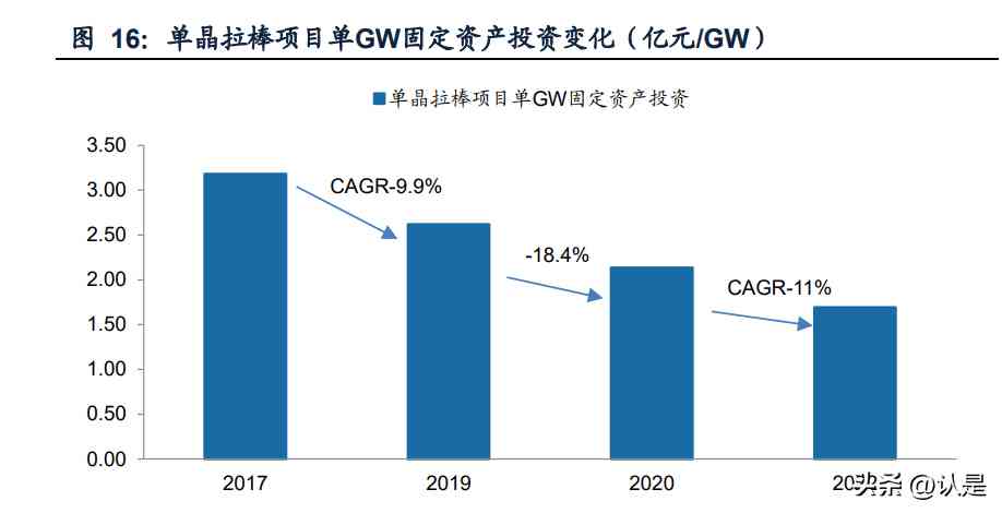 產(chǎn)業(yè)鏈技術進步導致硅片設備單位投資下降。由于拉晶技術進步、工藝提升、設備 更新?lián)Q代及硅片薄片化等因素,每GW硅片設備投資有所下降。例如,天合光能年產(chǎn) 35GW直拉單晶項目由于采用N型技術路線,對應N型電池光電轉(zhuǎn)換效率更高,并且 采用薄片工藝,單位產(chǎn)能所需的硅棒產(chǎn)量更少,因此單位產(chǎn)能所需的單晶爐等核心 設備的數(shù)量更少。以過去五年間各家公司的單晶拉棒擴產(chǎn)項目為例,我們測算出平 均單GW固定資產(chǎn)投資額下降較快,2017-2022年年均降幅為12%。