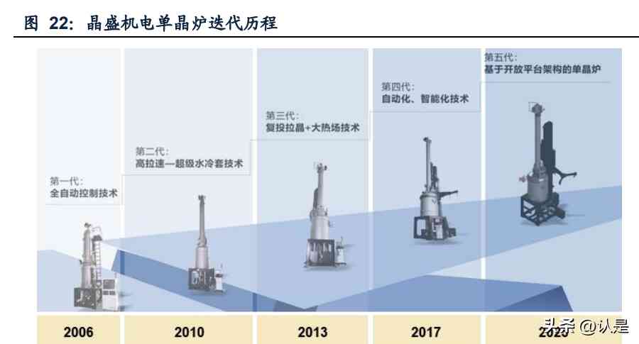 公司產(chǎn)品迭代能力優(yōu)秀,平均3~5年推出新一代單晶爐。2006年,晶盛機電推出第 一代全自動單晶爐;2010年研發(fā)出水冷套裝置,實現(xiàn)高拉速第二代單晶爐;2013年 研發(fā)出復投器+大熱場,開創(chuàng)第三代RCZ高產(chǎn)單晶爐;2017年研發(fā)出基于工業(yè)互聯(lián)網(wǎng) 的第四代智能化單晶爐。而2023年公司即將推出第五代新型單晶爐,配置了基于開 放架構(gòu)的用戶可編程的軟件定義工藝平臺,開啟新一輪迭代升級。