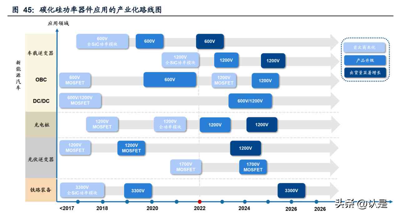預計新能源汽車和光伏逆變器領域的碳化硅高壓器件將在2024-25年實現(xiàn)量產(chǎn)。由 于碳化硅具有更高的擊穿電壓,且同等電壓下比硅同類器件擁有更低的導通電阻, 因此碳化硅在高壓和超高壓器件的優(yōu)勢明顯。根據(jù)Yole,目前在新能源車載逆變器 應用上1200V SiC器件已實現(xiàn)商業(yè)化,預計2025年將實現(xiàn)規(guī)模化量產(chǎn);光伏逆變器 也將在2023-24年實現(xiàn)1700V SiC器件量產(chǎn),以及1700V SiC MOSFET的產(chǎn)品升級。