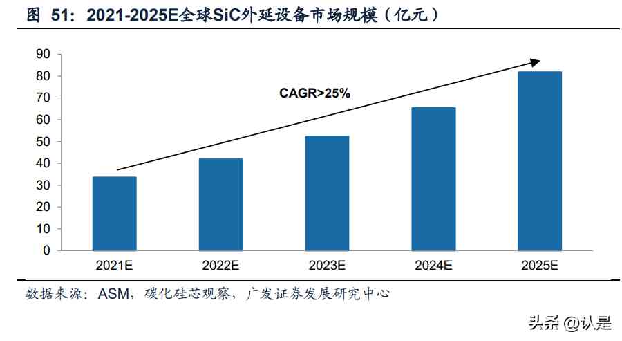 碳化硅外延設備是核心環(huán)節(jié),未來市場年均增速超25%。與Si器件不同,SiC器件不能 在晶圓上直接制作,而是需要在SiC晶圓上沉積生長外延膜,利用外延膜生產(chǎn)器件,所 以SiC外延設備在產(chǎn)業(yè)鏈中處于承上啟下的重要位置,因此價值量和利潤空間較高, 單臺價格在千萬左右。根據(jù)ASM估計,預計2021-2025年對SiC外延設備的需求將以 超過25%的CAGR增長;據(jù)此測算,2025年全球市場規(guī)模將超過82億元。
