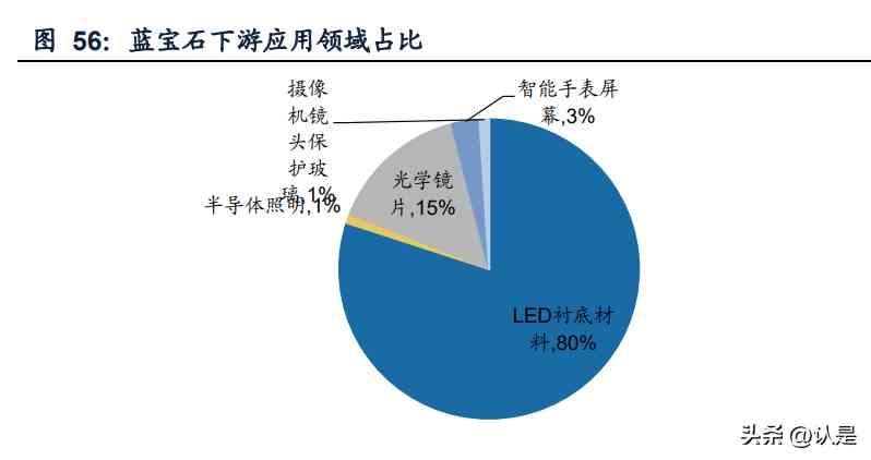 藍寶石應用領域廣泛。藍寶石俗稱剛玉,具有優(yōu)異的光學性能、機械性能和化學穩(wěn) 定性,其強度高、硬度大(莫氏硬度為9,僅次于鉆石,高于玻璃)、耐沖刷,可在 近2000高溫的惡劣條件下工作,因而被廣泛的應用于紅外軍事裝置、高強度激光的 窗口材料、半導體發(fā)光二極管(LED),是大規(guī)模集成電路SOI和SOS及超導納米結(jié)構(gòu) 薄膜等最為理想的襯底材料等。 LED襯底材料是藍寶石最重要的應用領域。從藍寶石下游應用占比來看,LED襯底 占比達80%,光學鏡片15%,智能手表屏幕3%,其余應用包括半導體照明、攝像頭 鏡頭保護玻璃等。