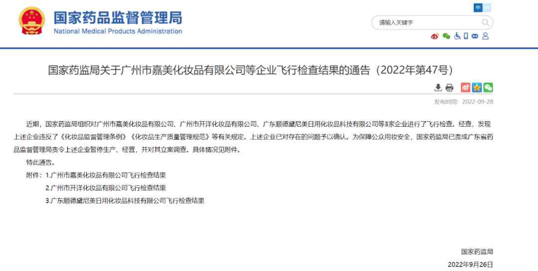 國家藥監(jiān)局:廣州市嘉美化妝品有限公司等3家化妝品公司停產(chǎn)并立案調(diào)查