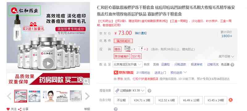 一款名為“仁和匠心”寡肽修護(hù)凍干粉的產(chǎn)品使用仁和藥業(yè)品牌在抖音等平臺投放廣告,宣稱高效祛痘。實(shí)際上,該產(chǎn)品與仁和藥業(yè)并無直接關(guān)聯(lián),實(shí)為仁和集團(tuán)旗下“仁和匠心”產(chǎn)品,但該產(chǎn)品在宣傳中大量使用上市公司“仁和藥業(yè)”的logo。
